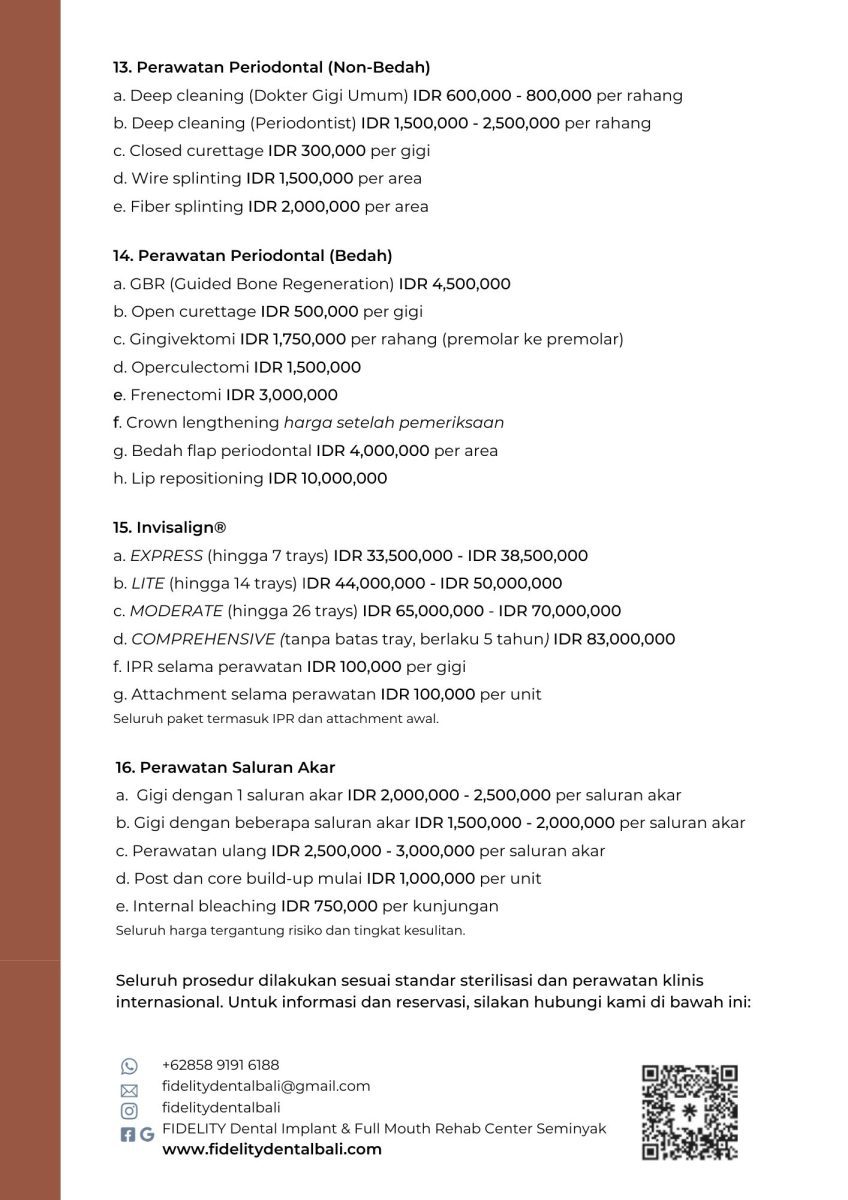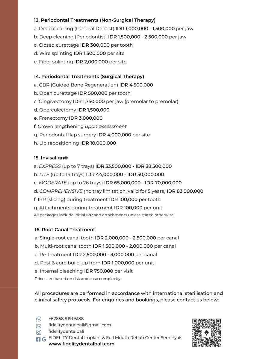 Are you searching for affordable yet high-quality dental care in Bali? At Fidelity Dental Bali, we offer a wide range of general, cosmetic, and advanced dental treatments at clear and competitive prices, with no hidden fees.